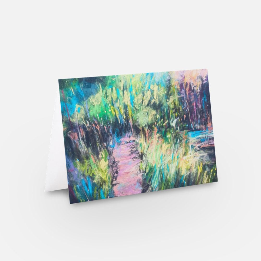 Strolling along, you come across a beautiful garden path. 4.6" x 7.2". 3 Blank Note Cards come with matching white envelopes in a resealable plastic bag. Artwork from a pastel painting I did.